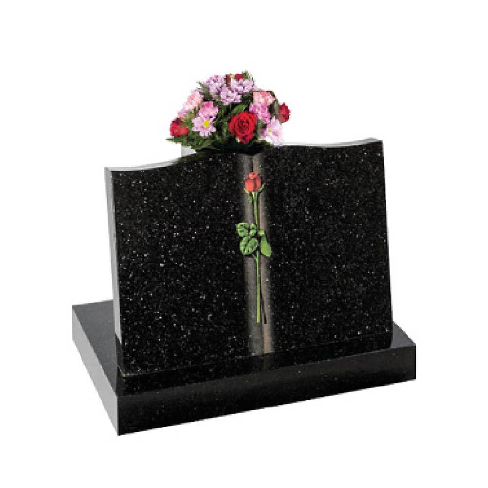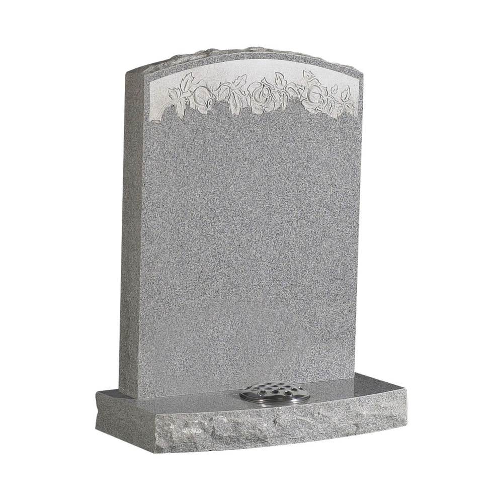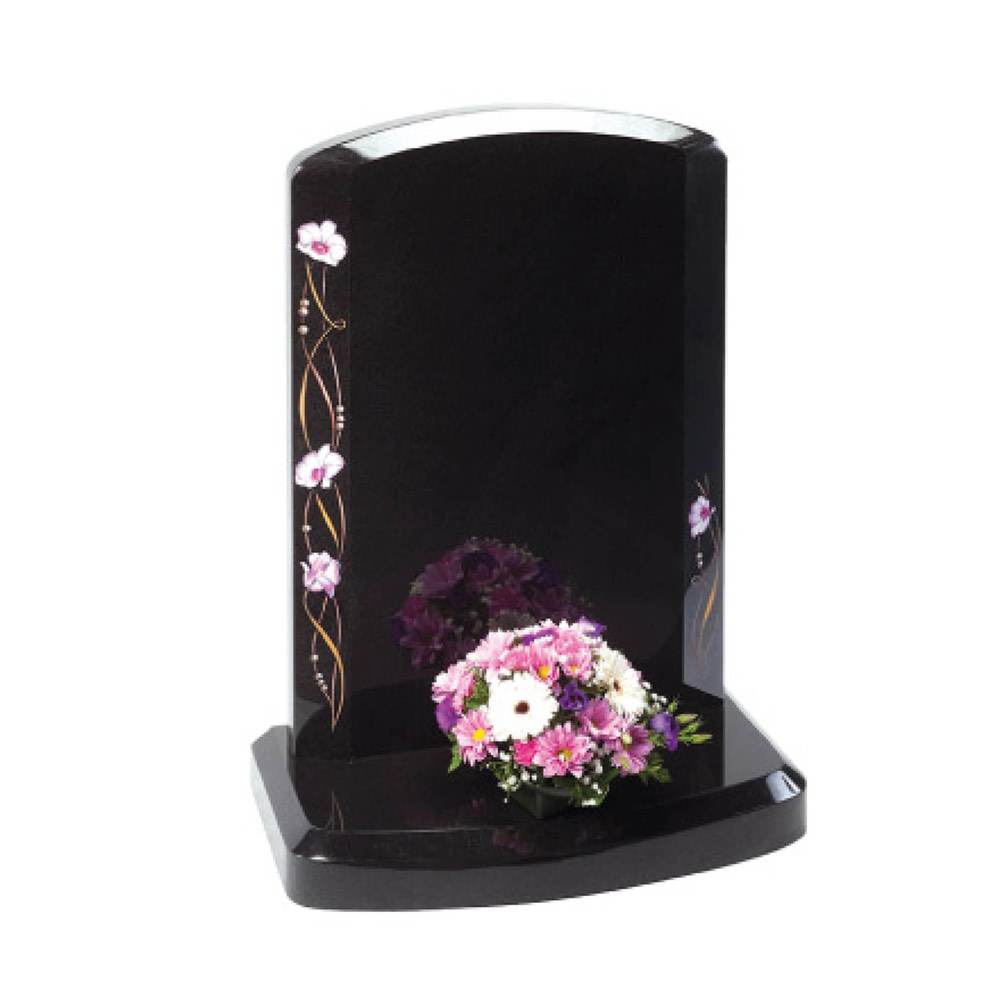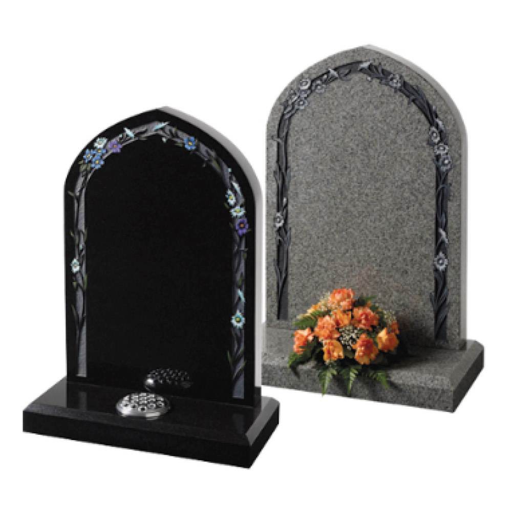 Fresh interpretation of the traditional gothic shaped memorial with a delicate floral border – Karin Grey or Black granite.