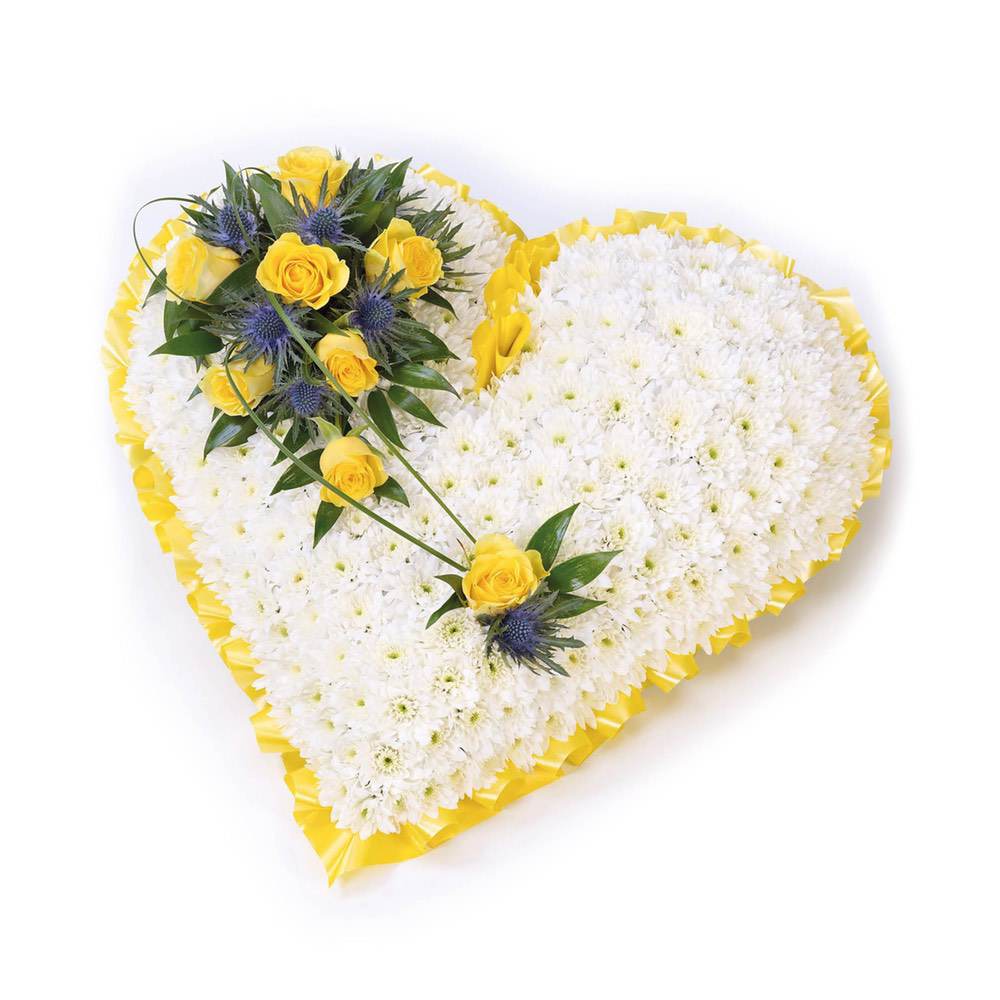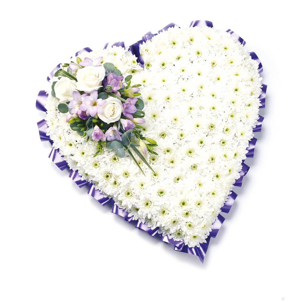 A classic heart-shaped design covered with a mass of double spray chysanthemums and finished with a spray of large-headed roses, eryngium and ruscus.