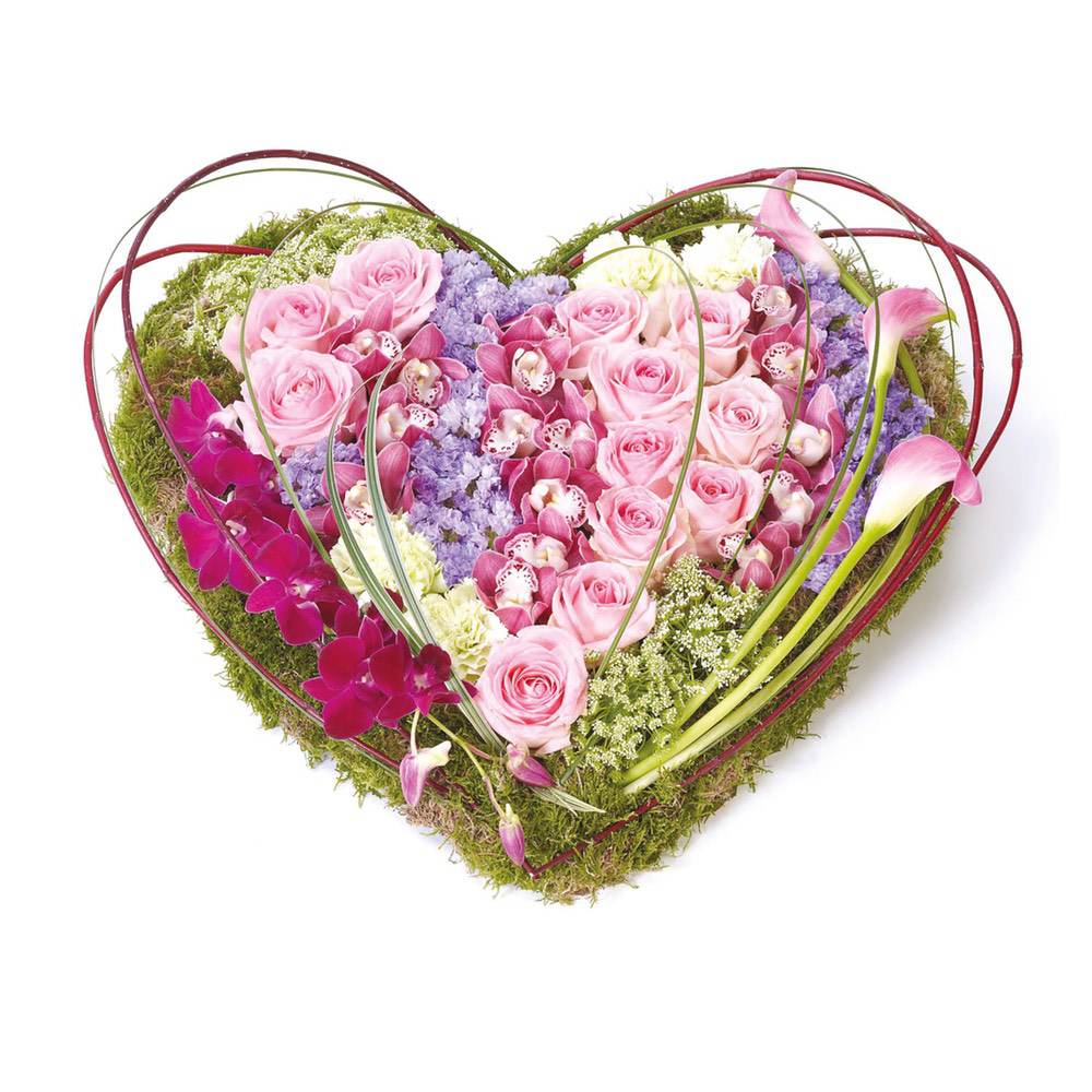 This heart-shaped design including large-headed roses, carnations and cymbidium and dendrobium orchids is given a contemporary feel with sweeping pink calla lilies, cornus and steel grass.