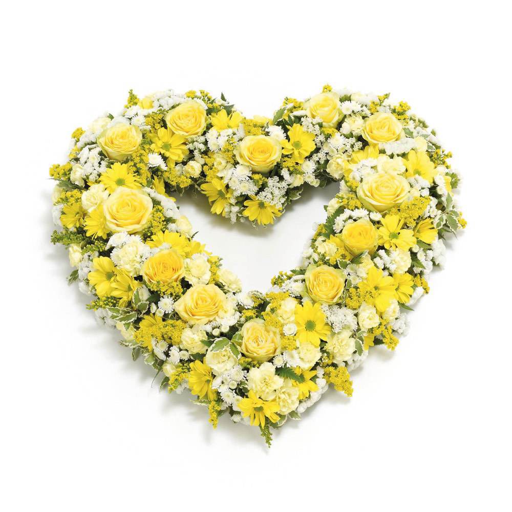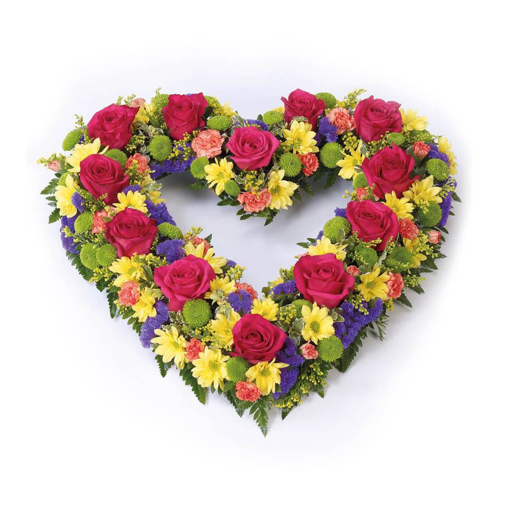 This open heart arrangement includes fresh roses, spray chrysanthemums, spray carnations and statice with solidago, pittosporum and leather leaf.