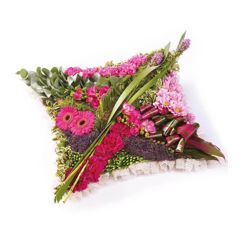 This striking contemporary cushion-shaped design features a selection of flowers in pinks and purples and includes liatris, carnations, germini, freesia and chrysanthemums.