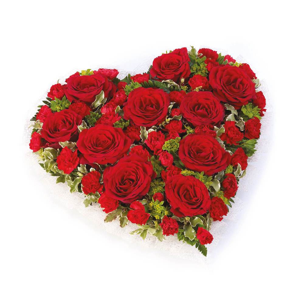 A traditional heart-shaped design including roses and spray carnations in rich red complemented by choice foliage.