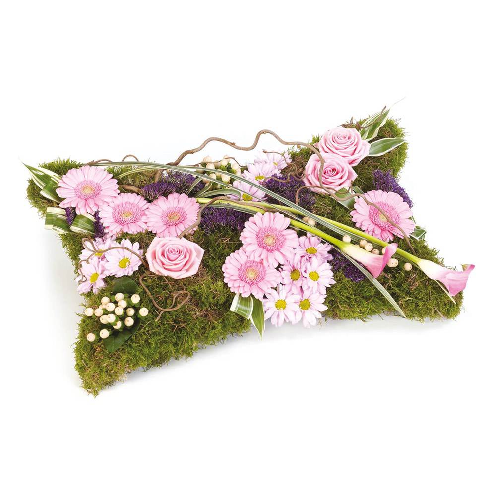 This pillow-shaped design has a woodland theme and includes pink large-headed roses, germini and spray chrysanthemums along with calla lilies and twisted hazel amongst an array of greenery.