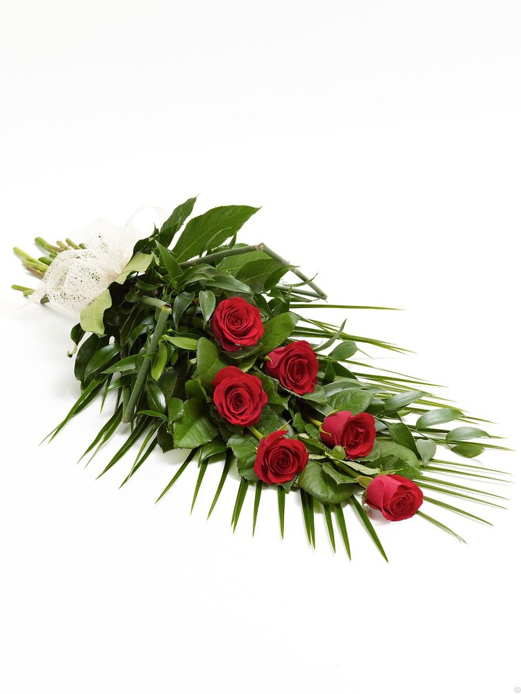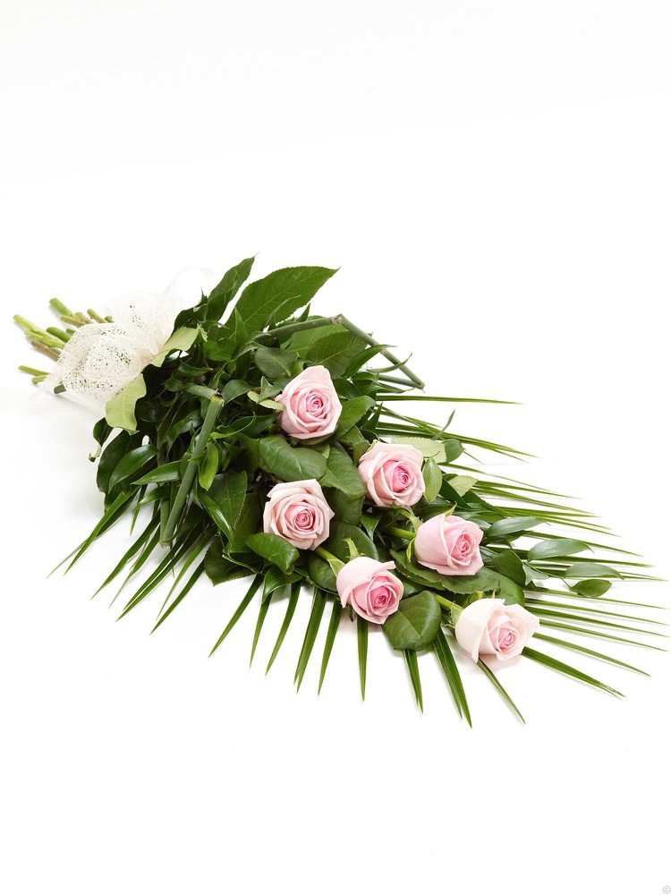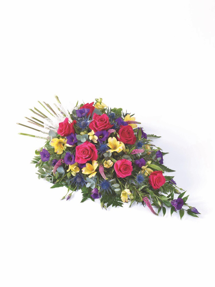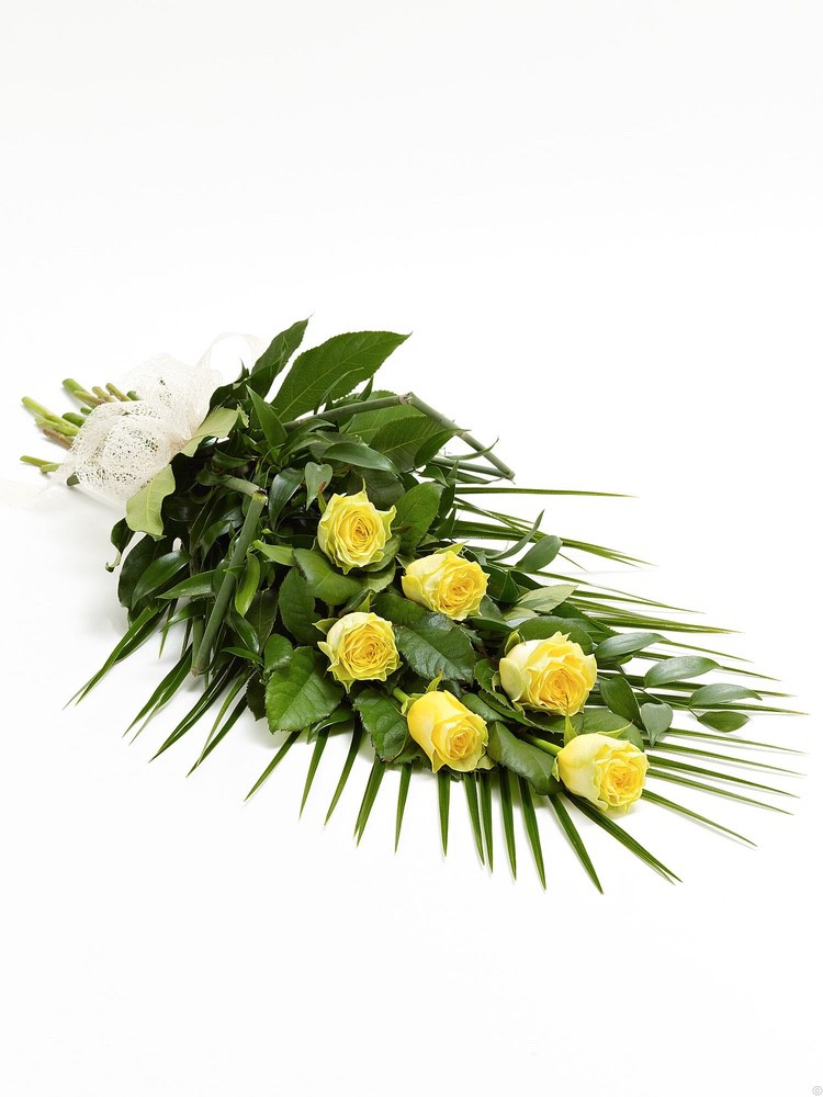 This sheaf of fresh flowers is simply arranged and presented wrapped and tied with a ribbon. The selection includes cream Asiatic lilies, blue iris, white carnations, yellow spray chrysanthemums, white September flowers and blue statice, hand-tied with leather leaf and palm leaves.